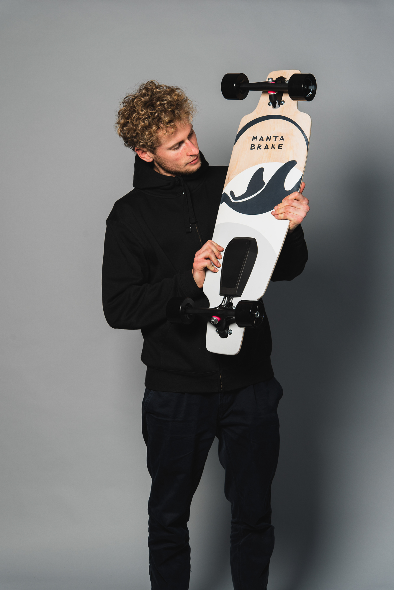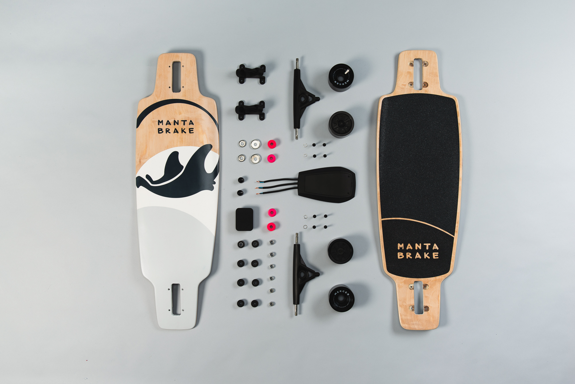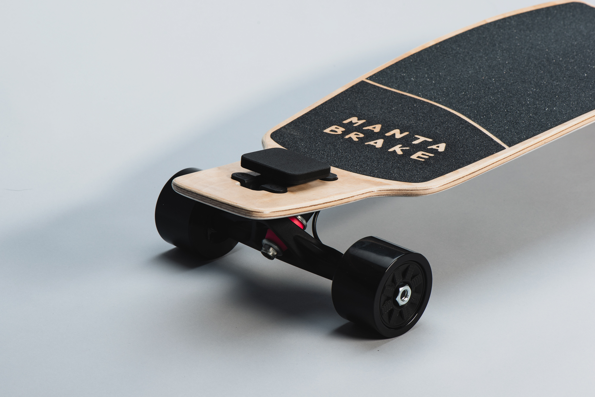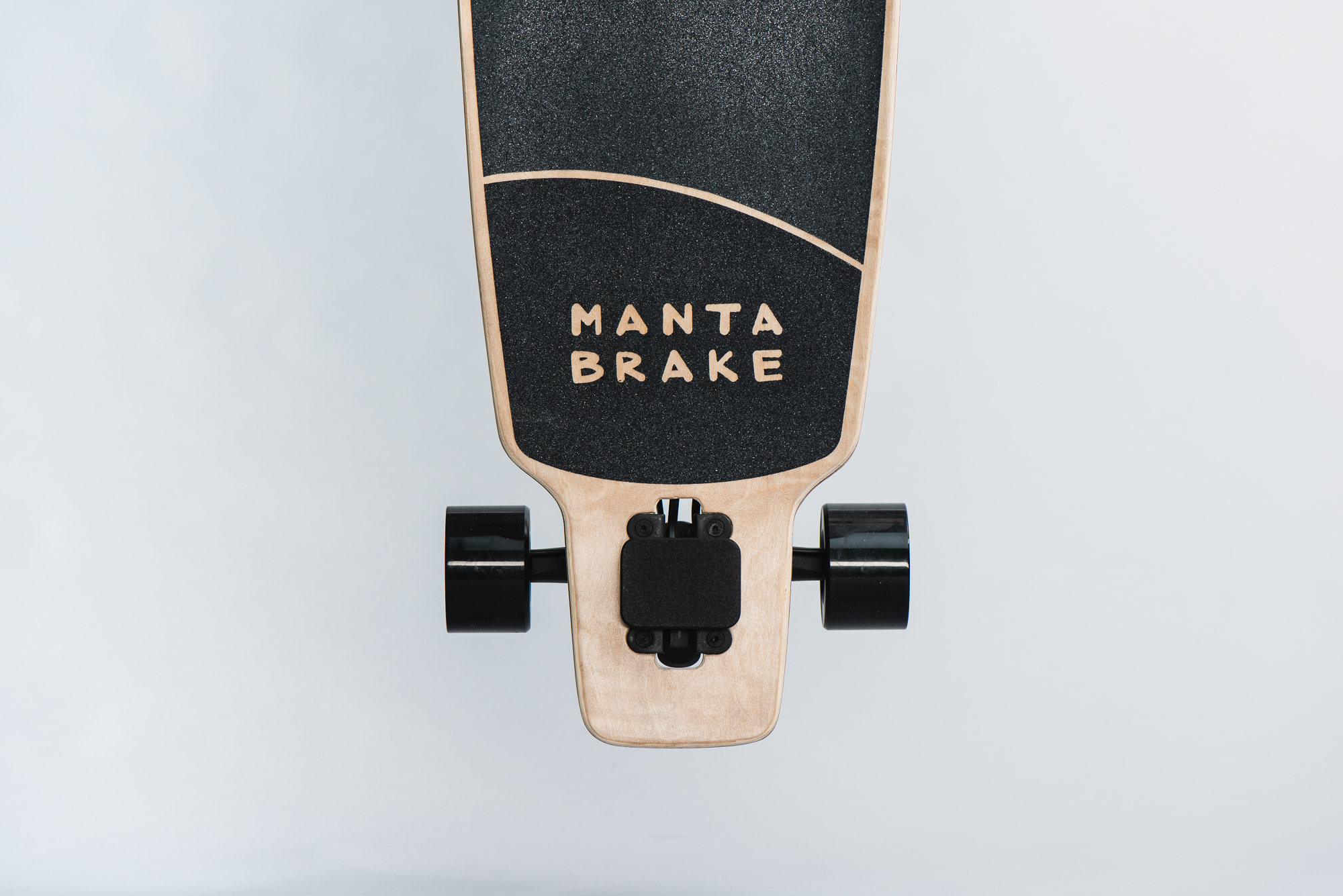Manta Brake is a brake module that is using an electromagnetic coil. If the brake button is pressed with your foot, the circuit is short-circuited and you start slowing down. The higher the speed, the stronger the magnetic field generated and therefore the braking force.